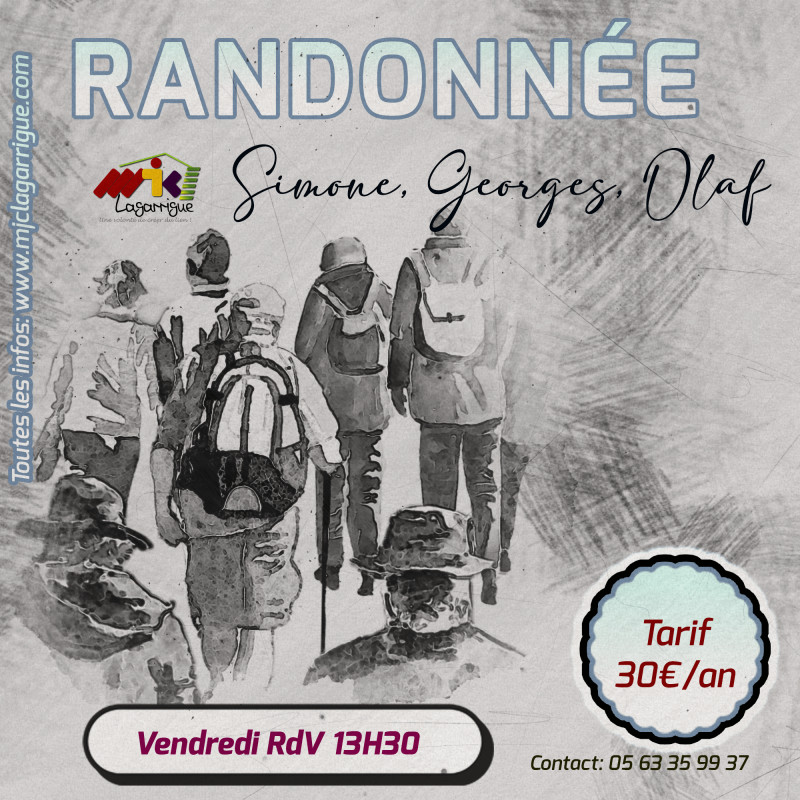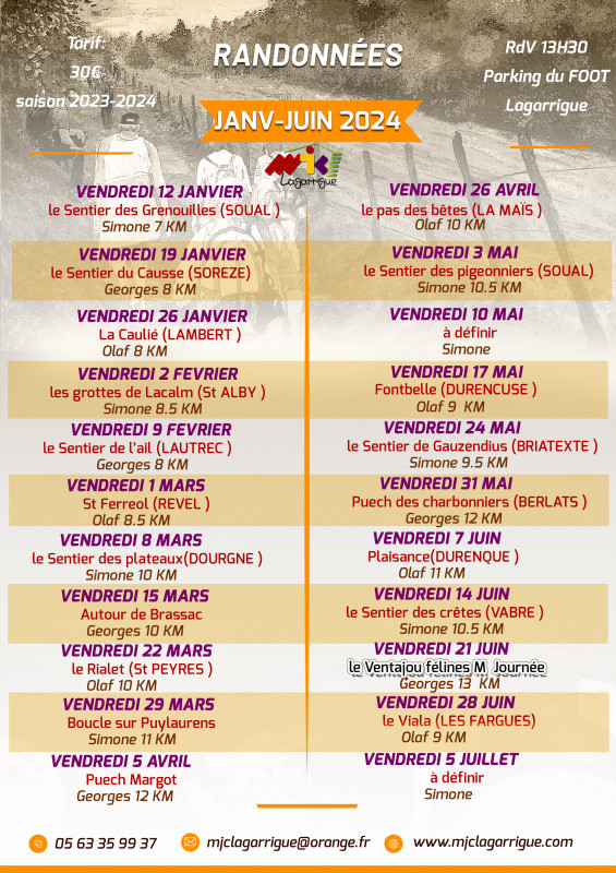 Le départ de Lagarrigue est fixé à 13 h 30 pour les après-midi et 8h30 pour les sorties à la journée, sur les parkings du stade Pierre-Rouquier, rue du Causse.