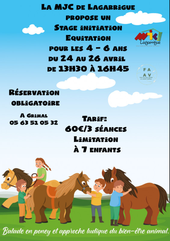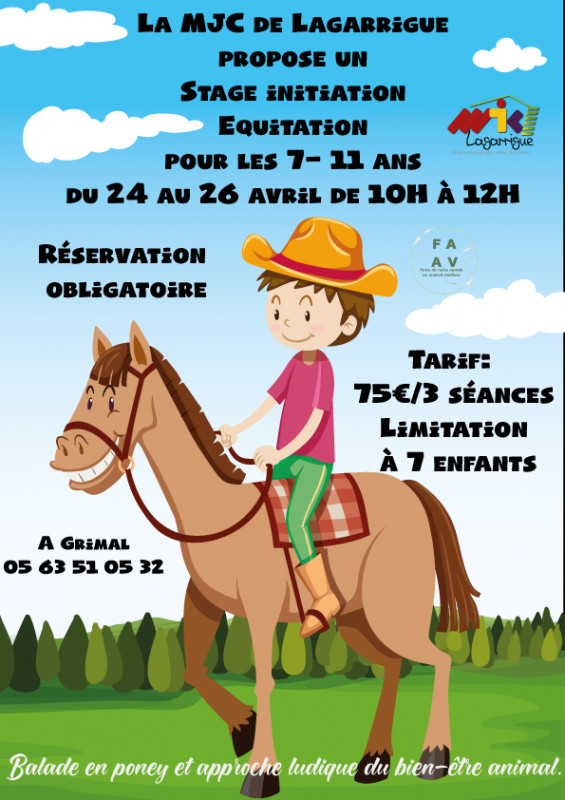 La MJC de Lagarrigue propose dans le cadre de son deuxième Festival À l'An Vert (FAAV 2023) des Stages "Initiation Equitation" du 24 au 26 avril 2023 pour les enfants de 4-6 ans de 13H30 à 16H45 et pour les enfants de 7- 11 ans de 10H00 à 12H00.