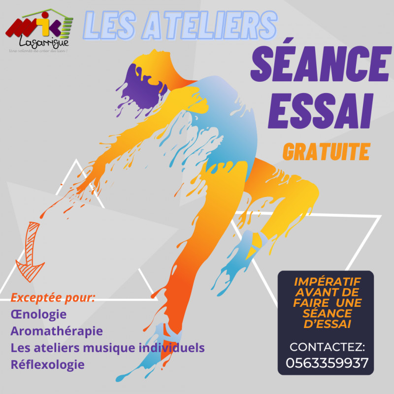 Nous vous rappelons que vous pouvez bénéficier d'une séance d'essai gratuite pour découvrir nos activités, à l'exception des ateliers d'œnologie, d'aromathérapie, de réflexologie, ainsi que des cours individuels de piano, guitare et batterie.