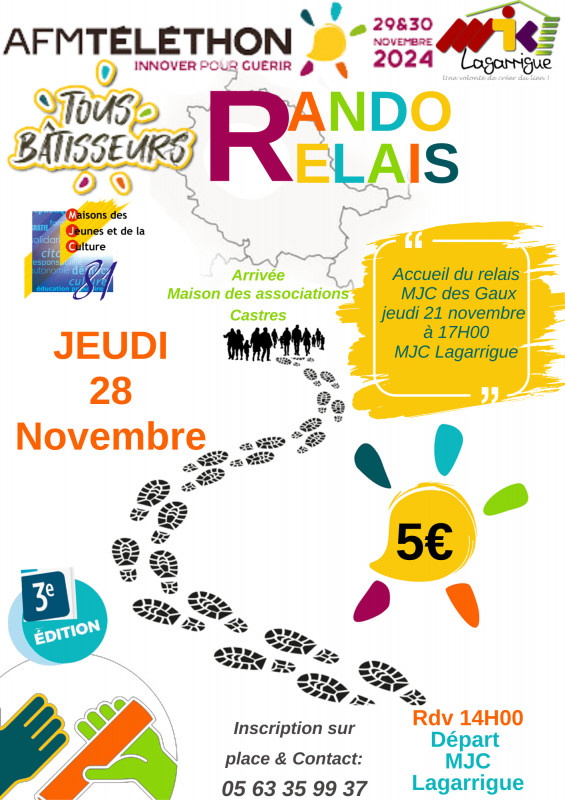 La Fédération Départementale des MJC du Tarn, le Comité Départemental de la Randonnée Pédestre, de nombreuses collectivités locales et associations organisent cette année la troisièmei édition du Relais Rando Téléthon en partenariat et avec le soutien de l’AFM Téléthon Tarn Sud dont le Président est M. Jacques Revol.