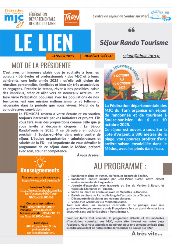 Ci-dessous vous trouverez le "Lien" le journal de la FD des MJC du Tarn qui présente ce séjour, son programme et les modalités d'inscriptions.