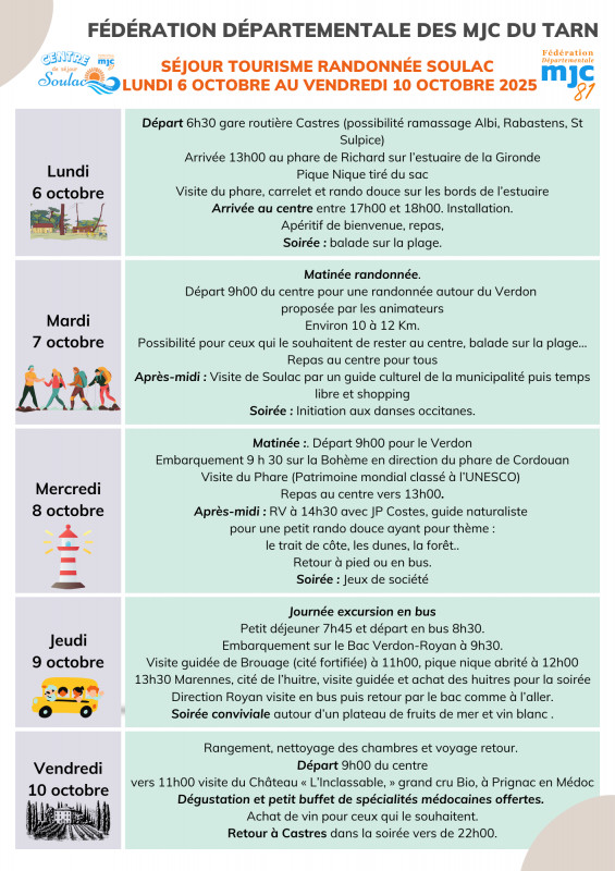 C'est parti pour les inscriptions pour le séjour Rando Tourisme à Soulac sur Mer du lundi 6 au vendredi 10 octobre 2025 organisé par la FDMJC81.