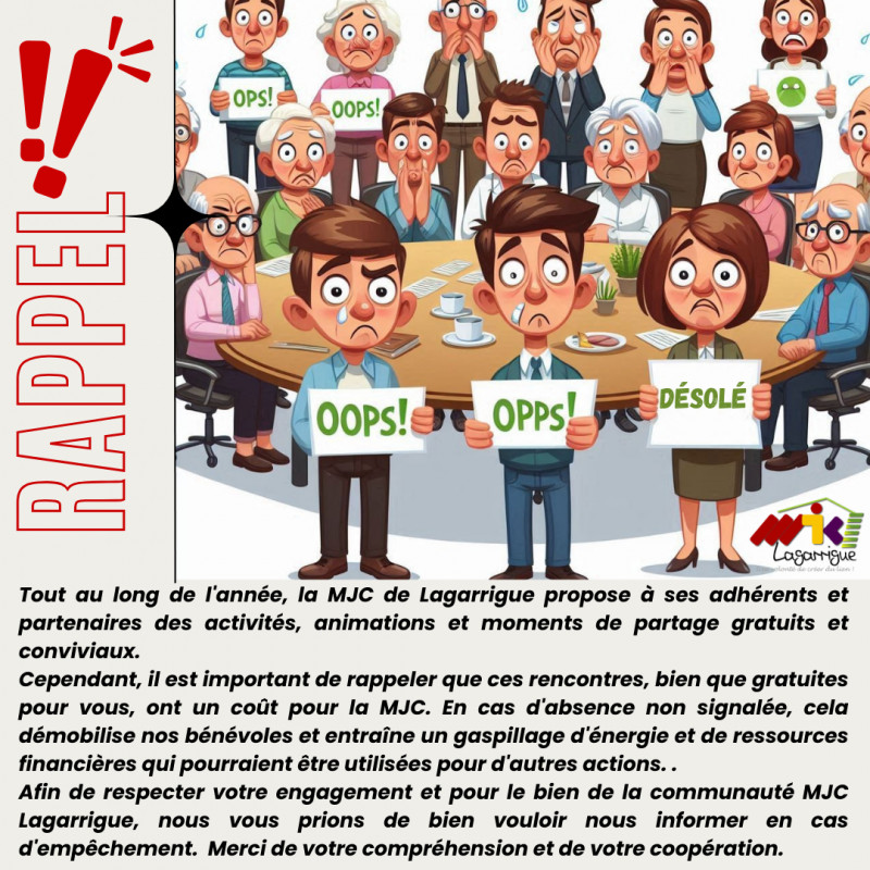 Afin de respecter votre engagement et pour le bien de la communauté MJC Lagarrigue, nous vous prions de bien vouloir nous informer en cas d'empêchement.