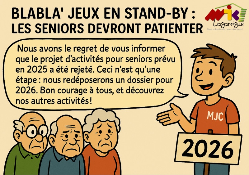 Nous souhaitions vous informer, avec transparence et sincérité, de l’évolution du projet « Blabla' Jeux », initialement prévu pour la rentrée de septembre 2025. Comme beaucoup d’entre vous l’attendaient avec enthousiasme, nous avions déposé un dossier de demande de soutien financier auprès de la Carsat Midi-Pyrénées, de l’Agence Régionale de Santé (ARS), ainsi que de l’AGIRC-ARRCO, dans le cadre de l’appel à projets « Lien social et innovation 2025 ».