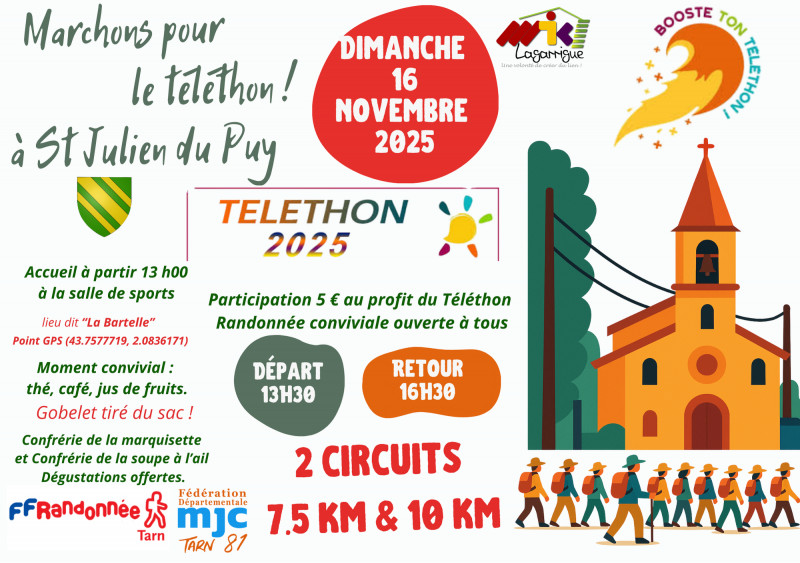 Le dimanche 16 novembre 2025, venez marcher à Saint-Julien-du-Puy pour une journée exceptionnelle de randonnée solidaire au profit du Téléthon. Deux circuits sont proposés : 7,5 km et 10 km, accessibles à tous les niveaux.