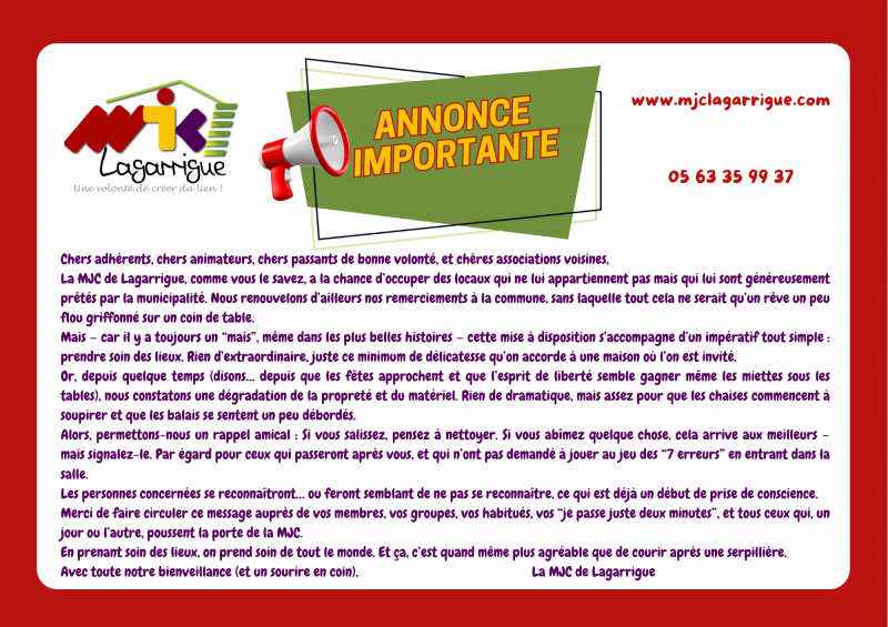 Merci de faire circuler ce message auprès de vos membres, vos groupes, vos habitués, vos “je passe juste deux minutes”, et tous ceux qui, un jour ou l’autre, poussent la porte de la MJC.