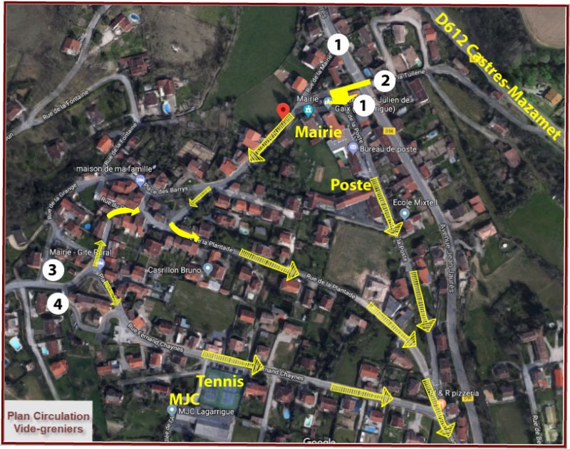 ❶Pour les rues de la mairie et place des Barrys, arrivée par Jean Jaurès et repartir par rue de la Plantade,