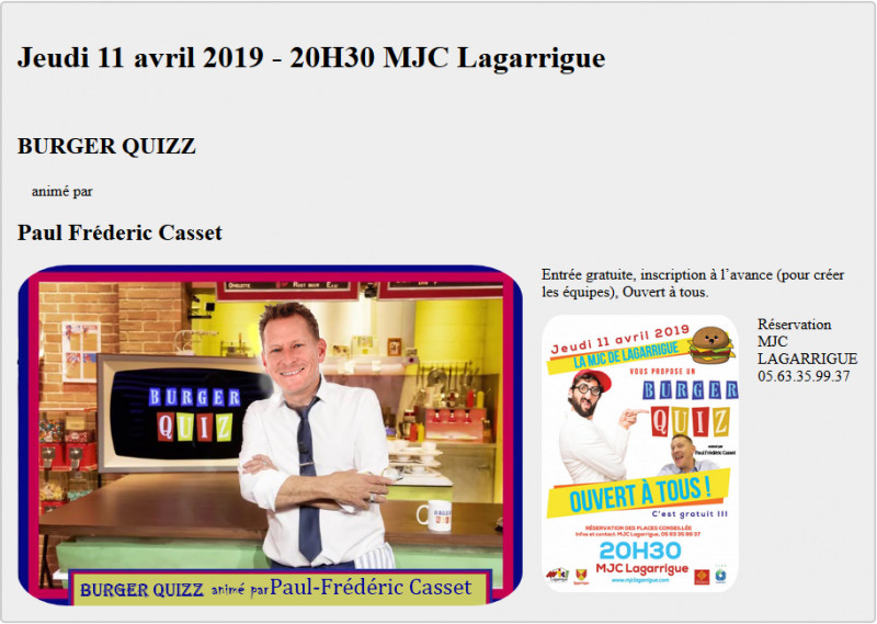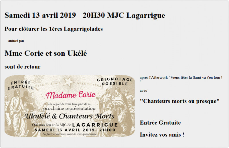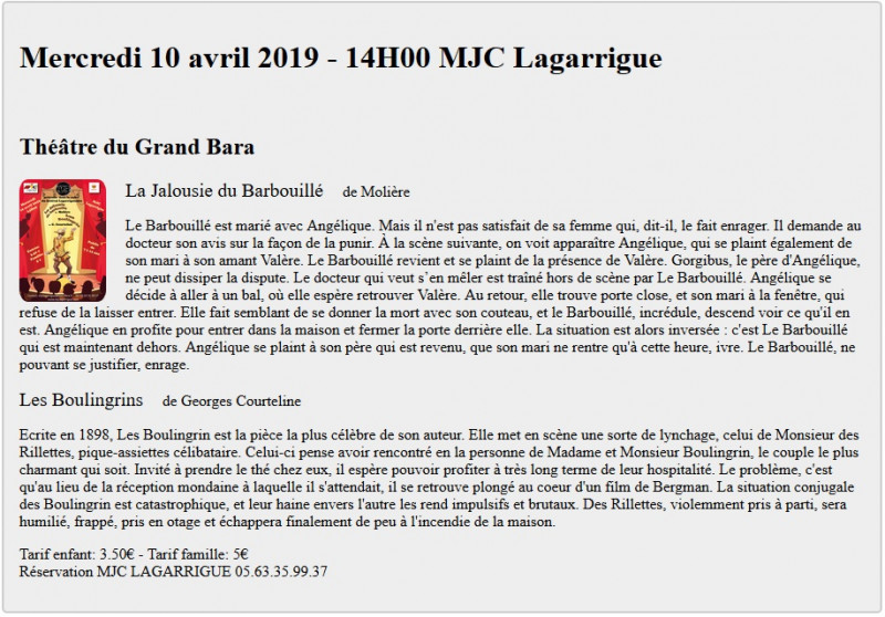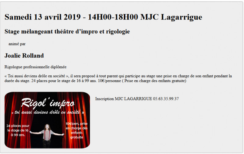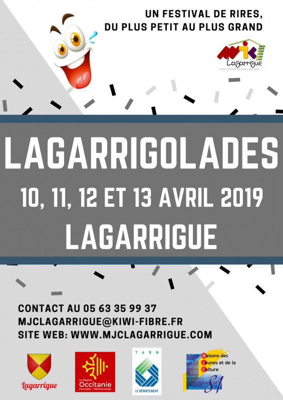 Suite au succès des 10 éditions de la semaine sans télé et sans écrans de Lagarrigue, les bénévoles de la MJC de Lagarrigue ont décidé de se renouveler et de vous proposer les premières « Lagarrigolades » ayant pour thème : « Quel Bonheur de faire rire ! »