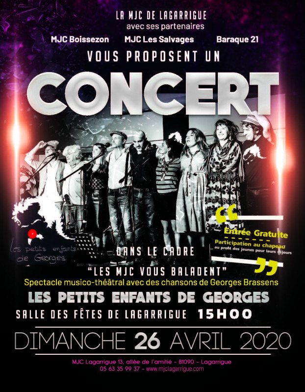 A 15h00, afin de finir cette journée, un spectacle musico-théâtral à partir de chansons de Georges Brassens avec la troupe «Les petits enfants de Georges» vous sera présenté. Entrée gratuite avec participation au chapeau au profit de l’action «Jeunes» de Lagarrigue.
