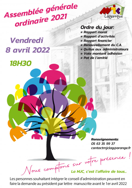 J’ai l’honneur de vous inviter à l’Assemblée Générale de la MJC de Lagarrigue, relative à l’exercice 2021, qui se déroulera :
