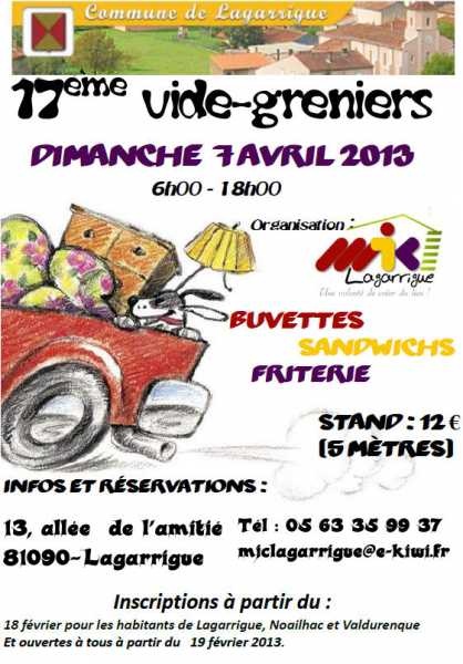 Renseignements : au 05 63 35 99 37 inscription impérative au bureau du secrétariat de la MJC de Lagarrigue Tarif : 12 € les 5 mètres lineaires Bulletin d'inscription au format pdf à télécharger et à déposer au secrétariat de la MJC accompagné du réglemenent et d'une copie de votre piece d'identité. |