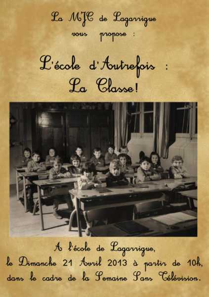• A l’occasion de la 5ème édition de la semaine sans télé qui se déroulera du 19 au 26 avril 2013, la MJC de Lagarrigue organisera une journée « Ecole d’autrefois » le dimanche 21 avril 2013 dans les locaux de l'école de Lagarrigue