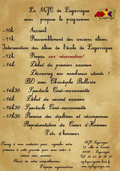 réservation, ,une participation aux épreuves du certificat d'études, des jeux, des spetacles ; des concerts,  une exposition, le rassemblement d' anciens élèves  et enseignants de Lagarrigue, etc…