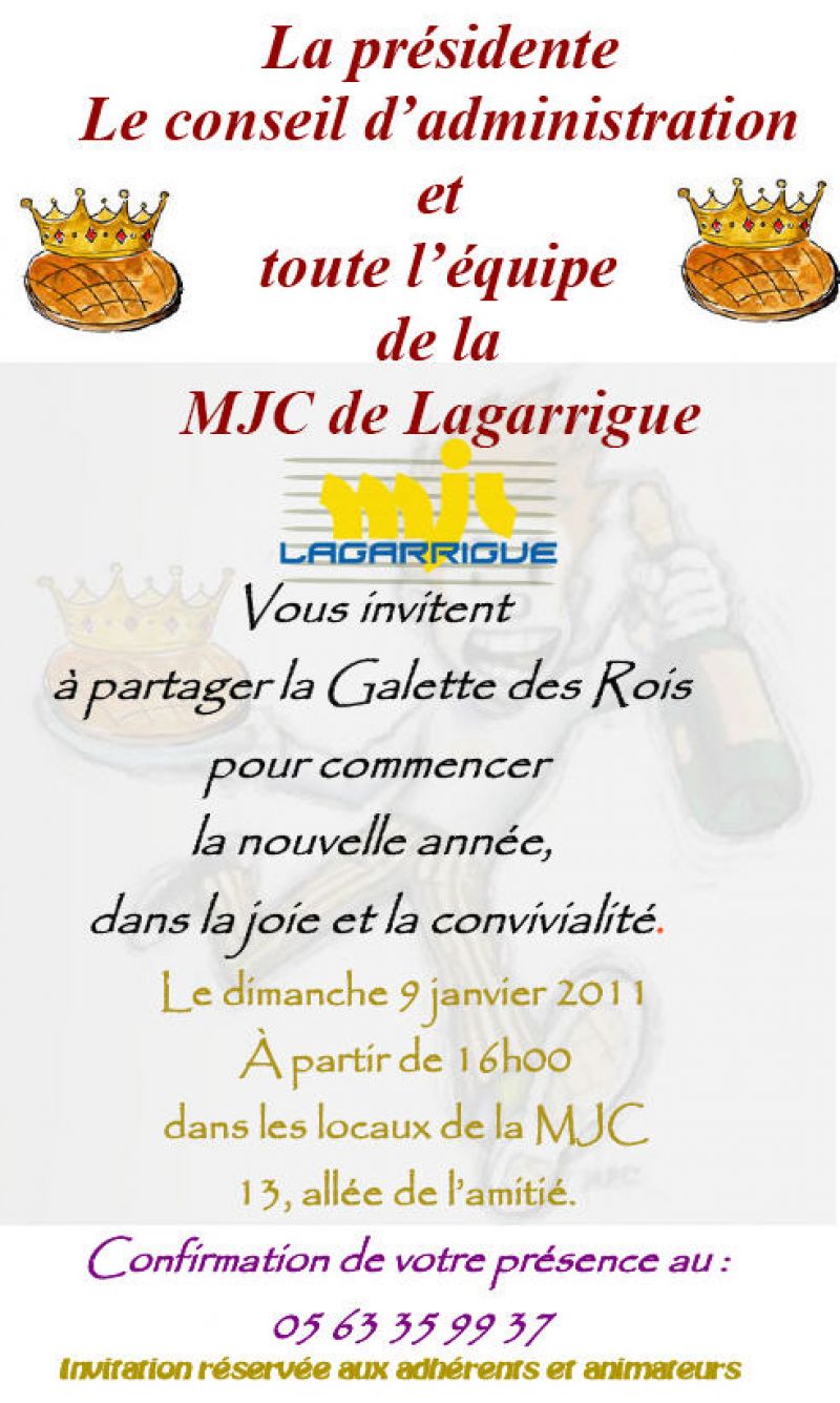 La présidente, le conseil d’administration et toute l’équipe de la MJC de Lagarrigue ont présenté leurs vœux aux adhérents , animateurs et partenaires qui ont répondu présent à cette invitation pour partager la Galette des Rois afin de commencer la nouvelle année dans la joie et la convivialité. Cliquer sur les photos pour agrandir,. Une fois l'agrandissement ouvert, si vous voulez enregistrer la photo, faites clic droit de la souris et faites enregistrer images sous un répertoire de votre choix.
