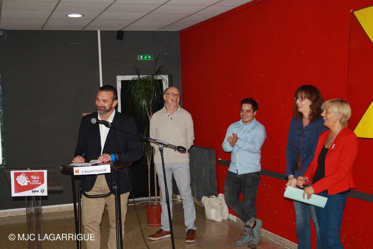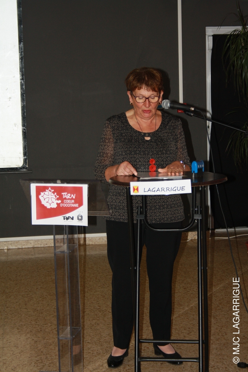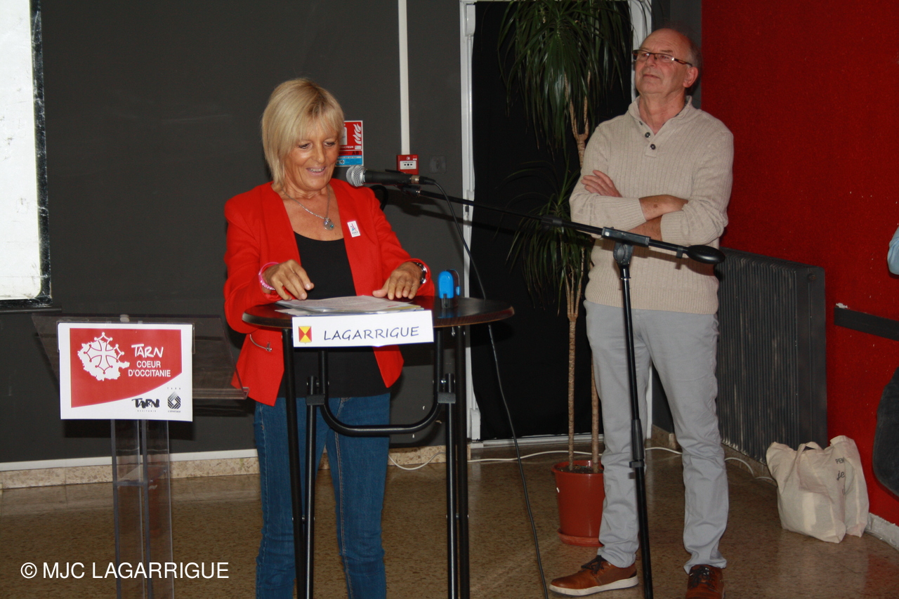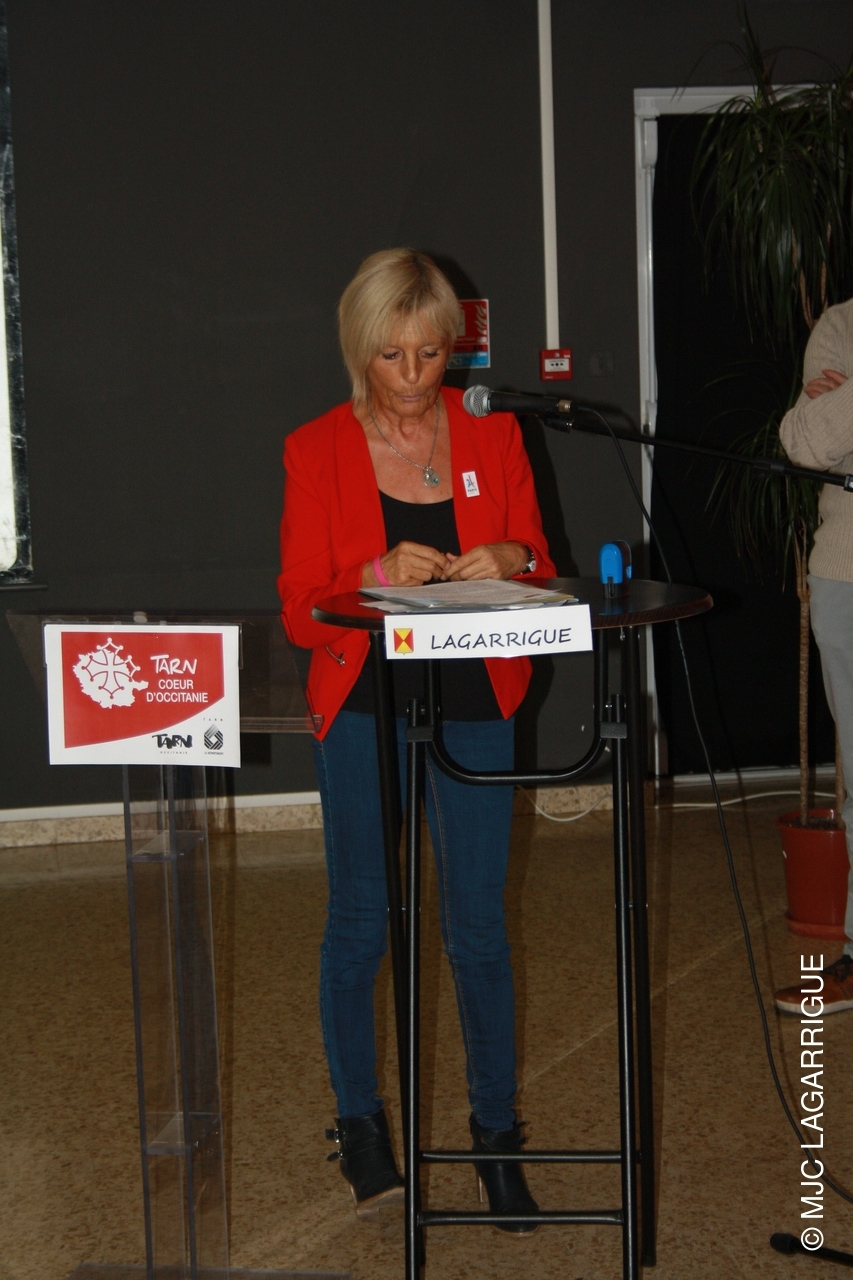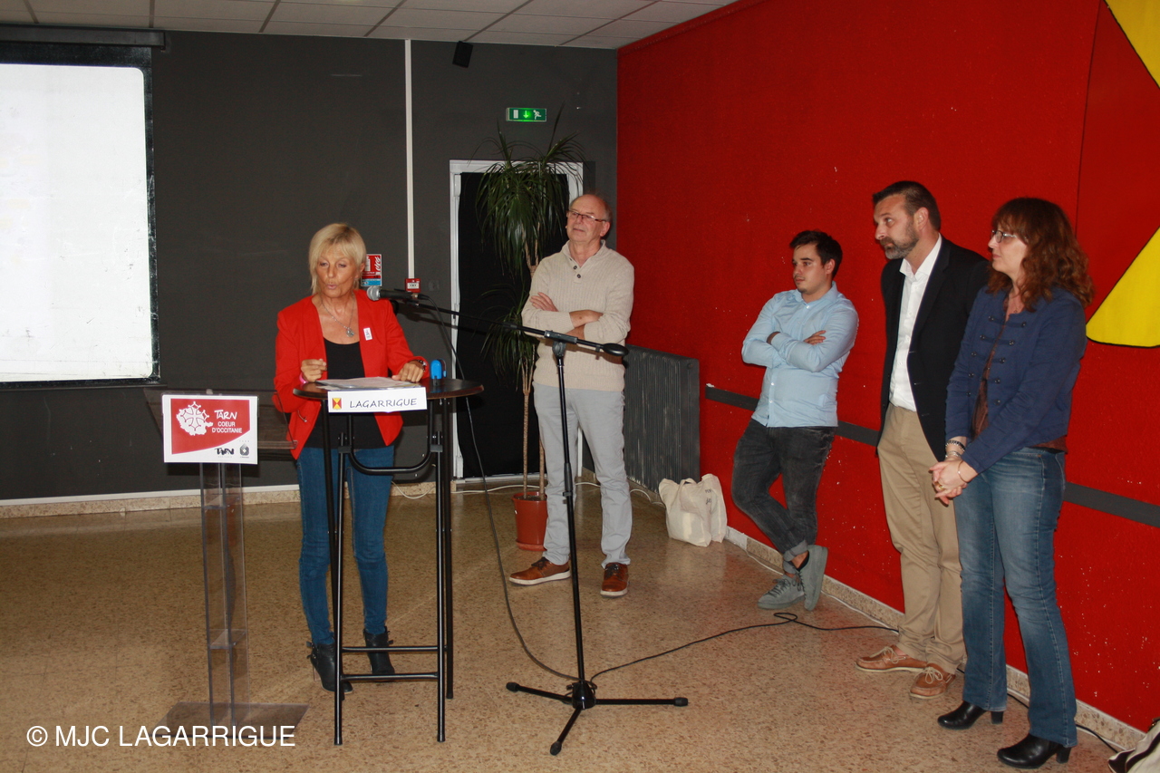 Discours de Yves Guminski (président MJC Lagarrigue), Solange Pistre (la nouvelle présidente du Centre Occitan du Pays Castrais), Vincent Colom (maire de Lagarrigue) et pour conclure avant les signature Cathy Rabou, représentant le Président du Conseil Départemental du Tarn.
