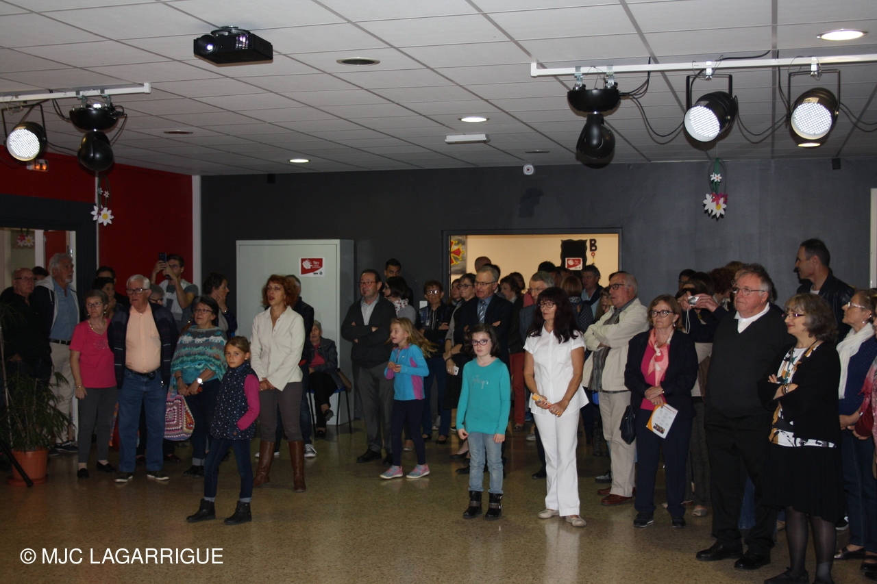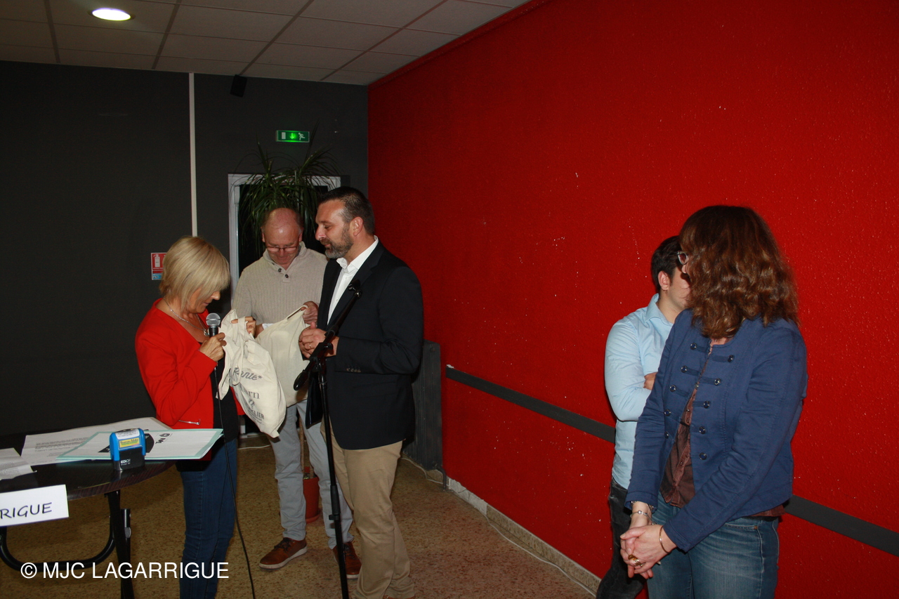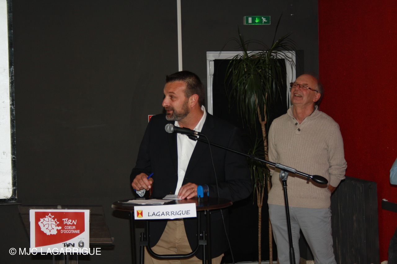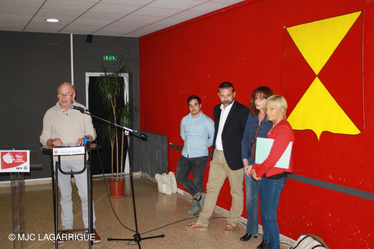 Discours de Yves Guminski (président MJC Lagarrigue), Solange Pistre (la nouvelle présidente du Centre Occitan du Pays Castrais), Vincent Colom (maire de Lagarrigue) et pour conclure avant les signature Cathy Rabou, représentant le Président du Conseil Départemental du Tarn.