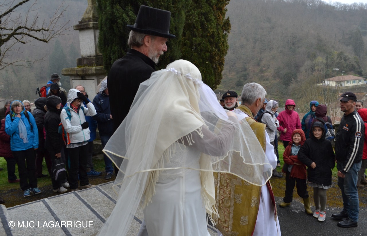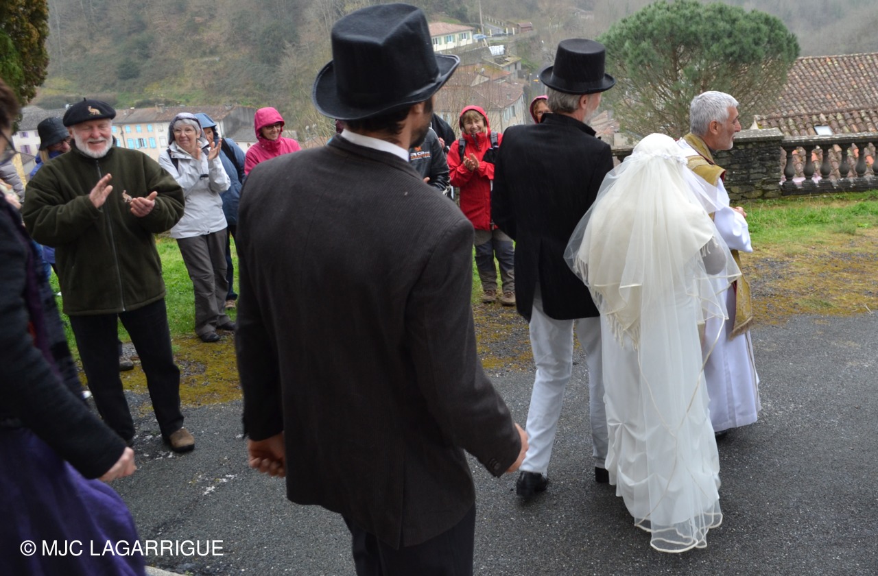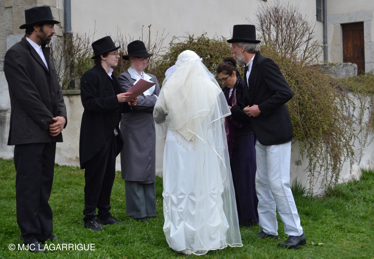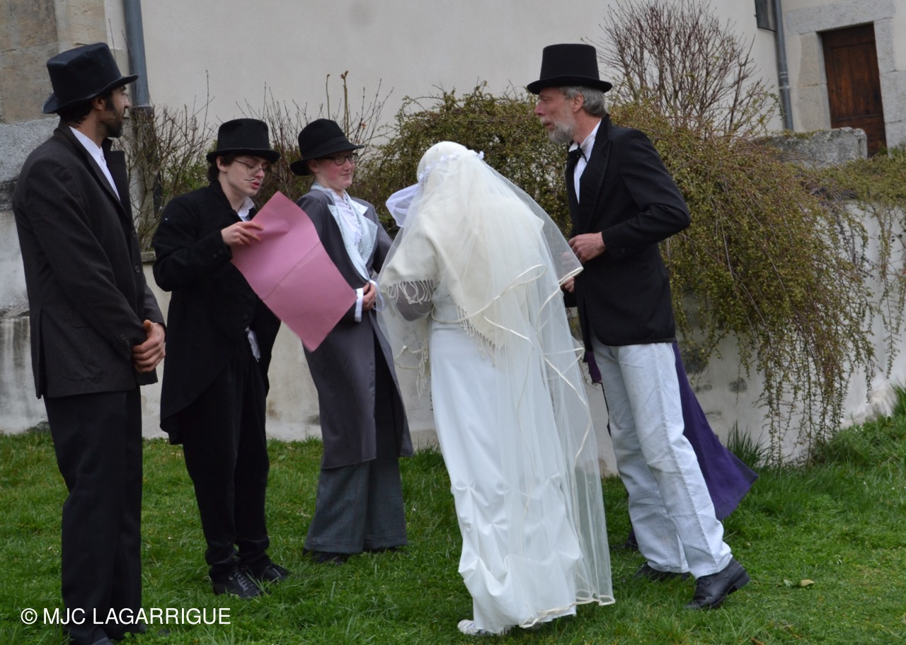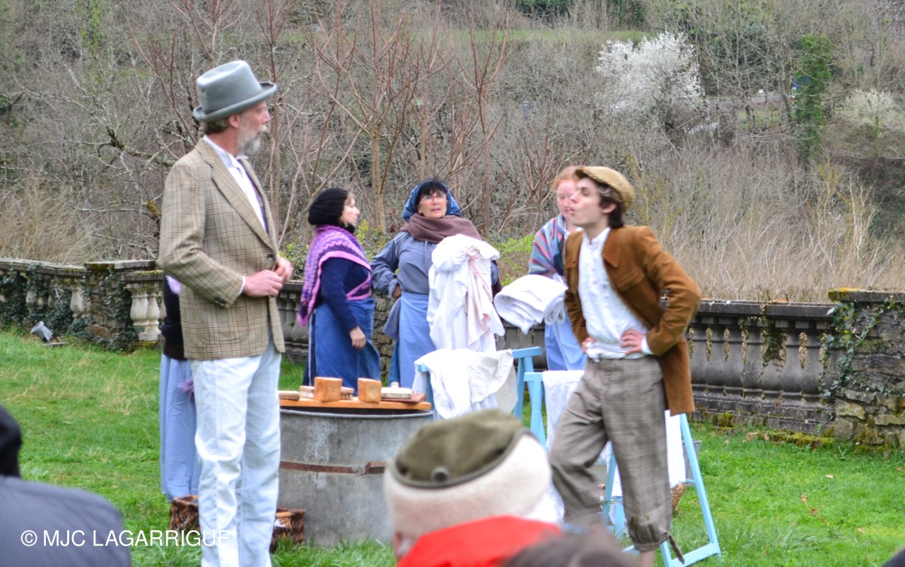 Suite à cette pause bien méritée, appréciée par tous, malgré des conditions météorologiques qui se sont légèrement dégradées avec l’apparition d’un léger crachin, le théâtre de l’Isatis de Lautrec nous a ravis en interprétant « Meunier veut marier sa fille » en extérieur dans le village.