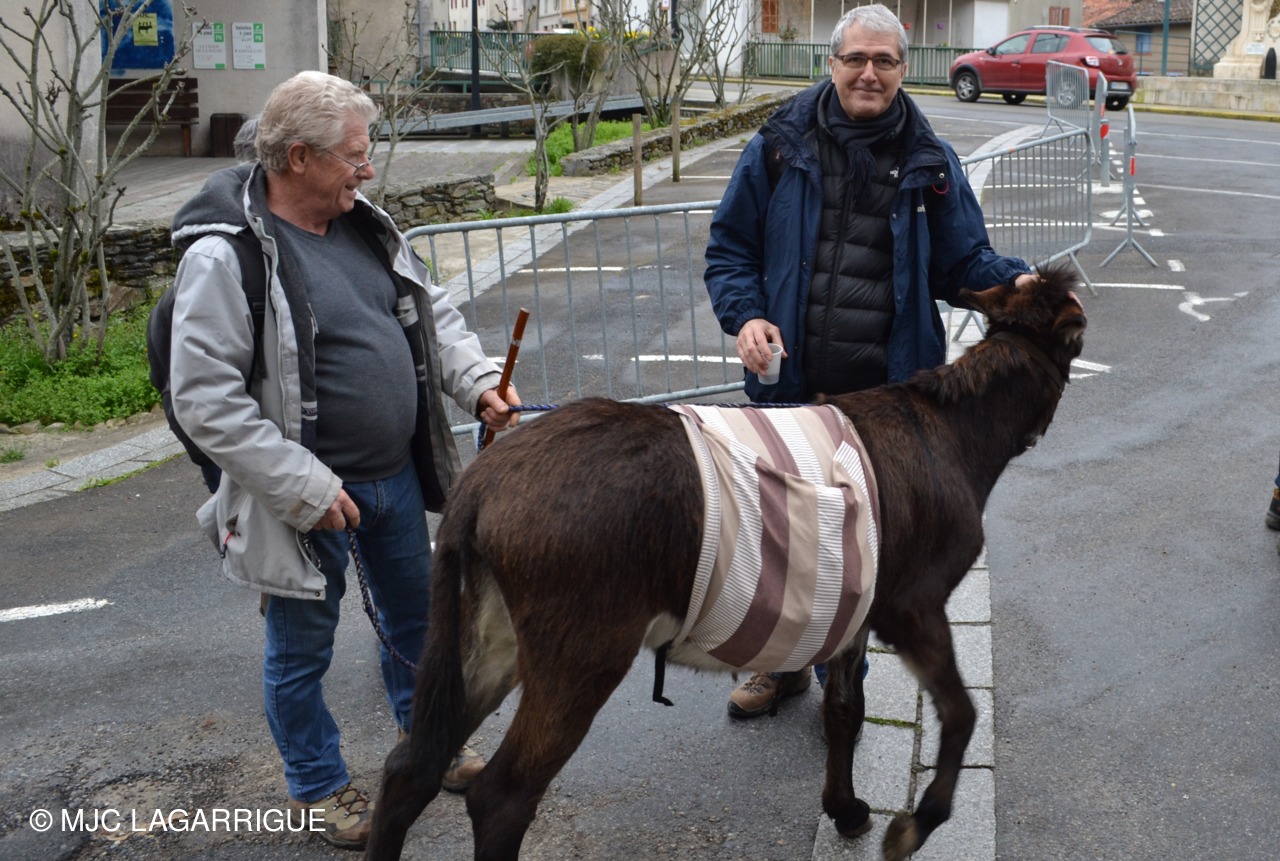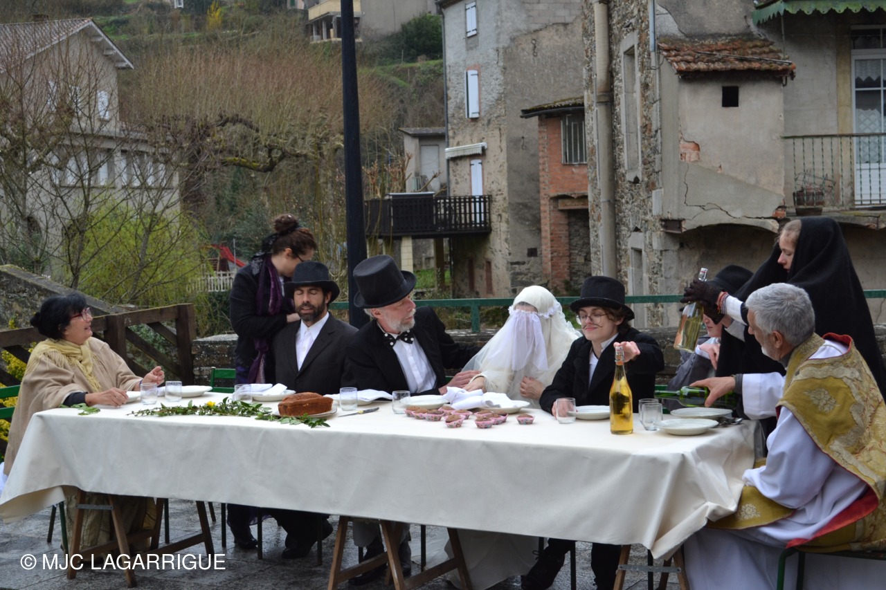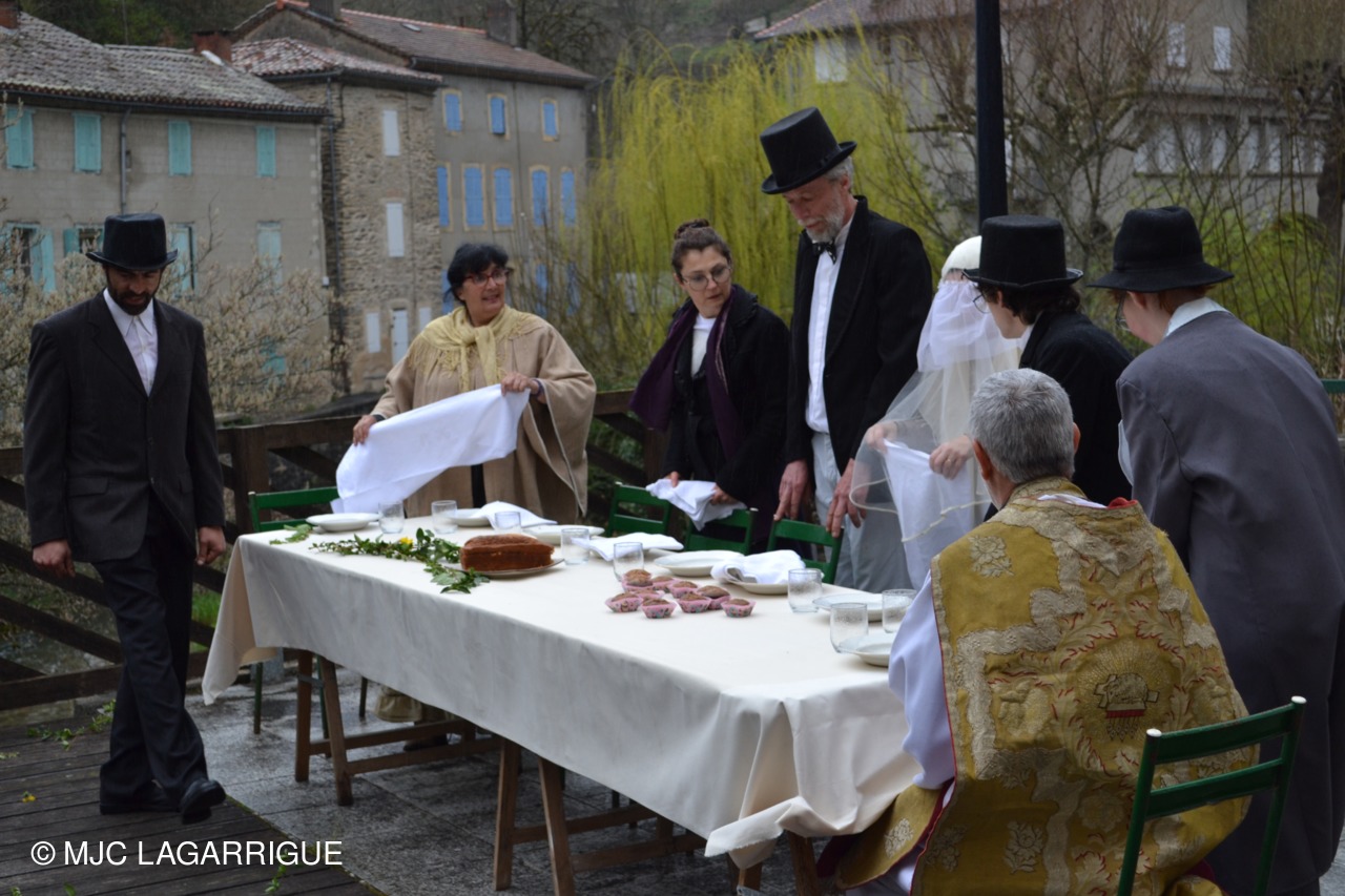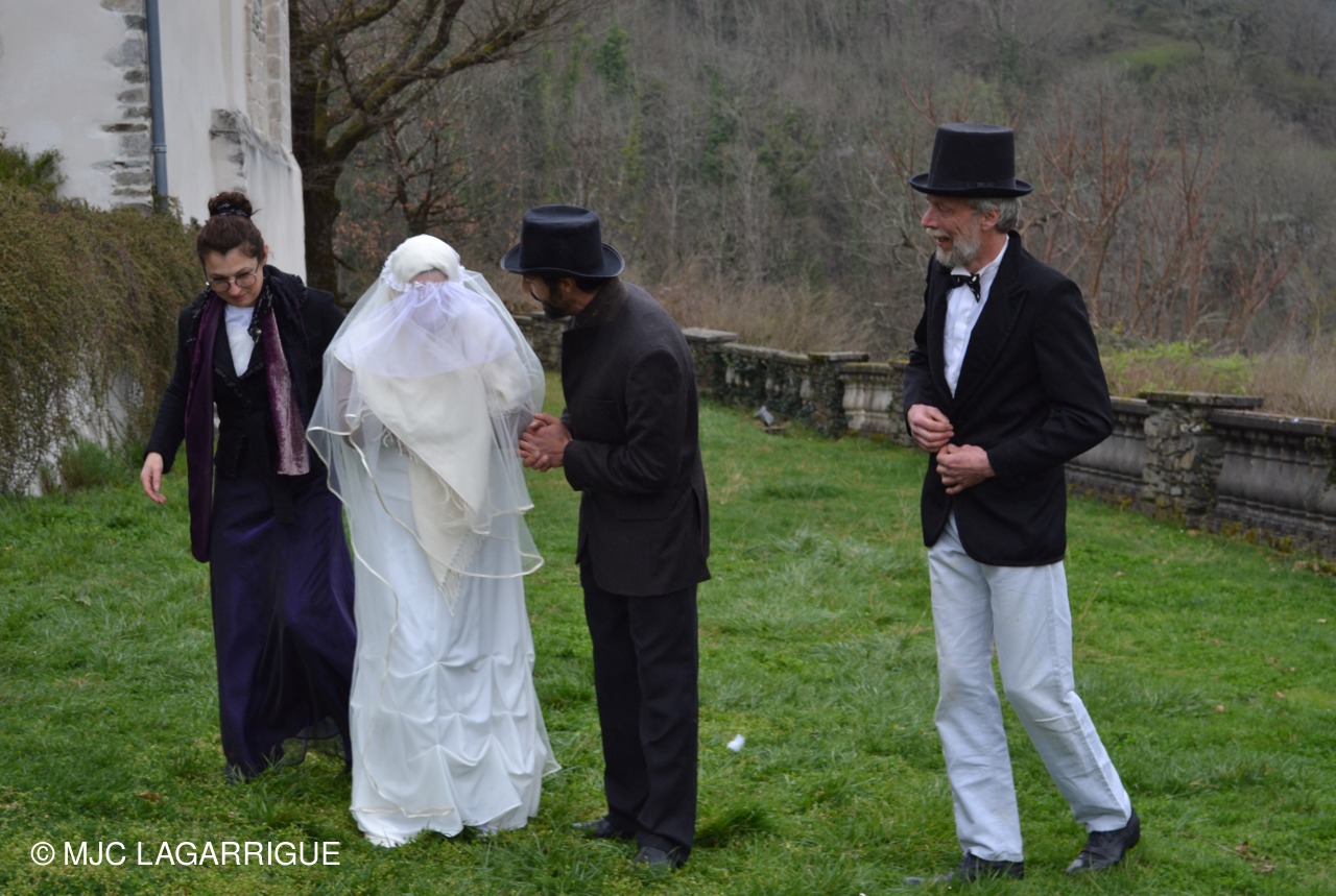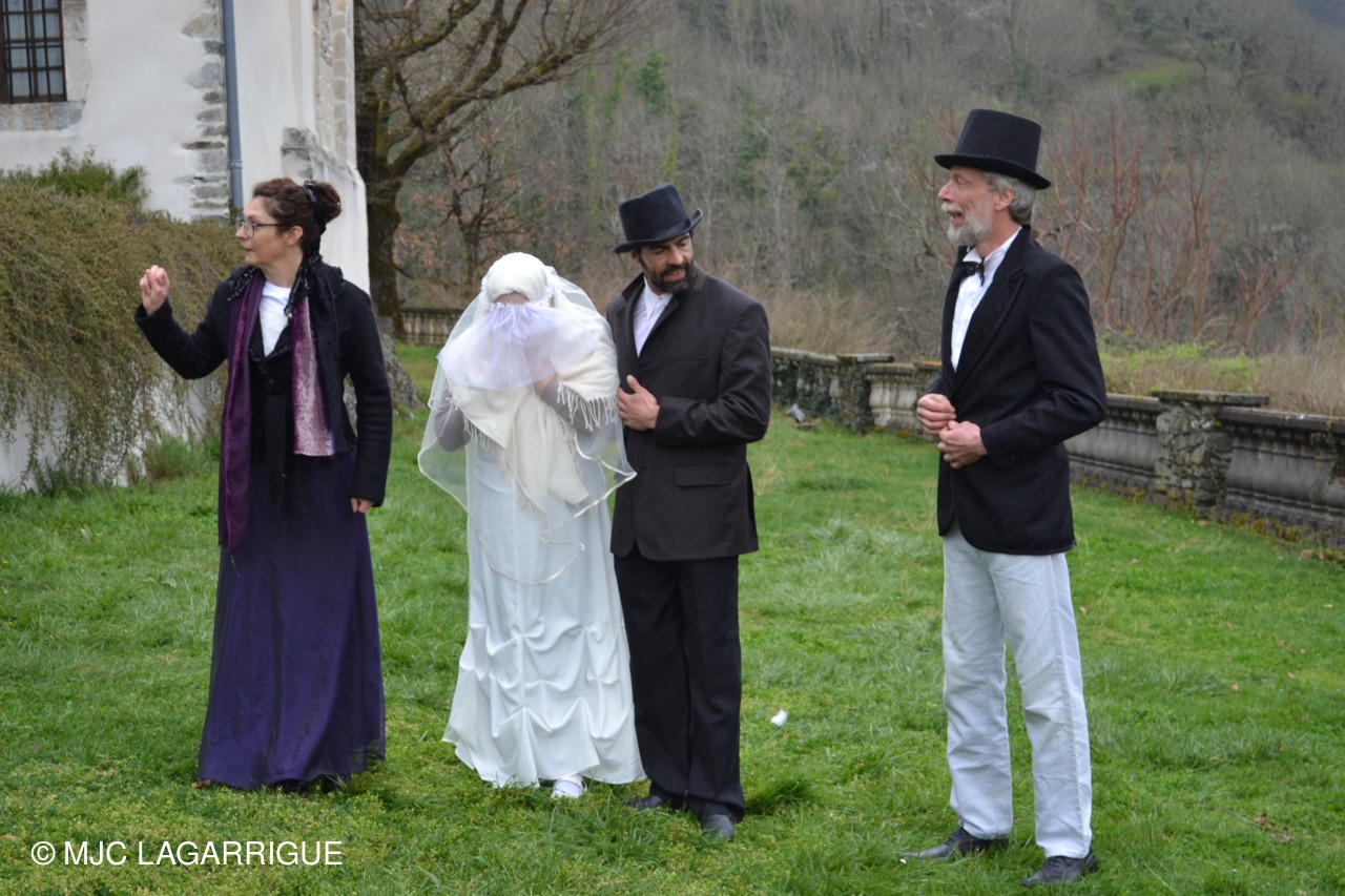 Suite à cette pause bien méritée, appréciée par tous, malgré des conditions météorologiques qui se sont légèrement dégradées avec l’apparition d’un léger crachin, le théâtre de l’Isatis de Lautrec nous a ravis en interprétant « Meunier veut marier sa fille » en extérieur dans le village.