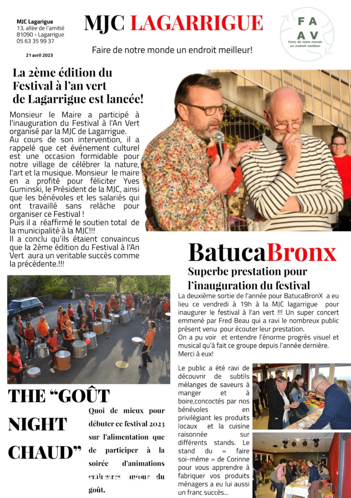 Voici le petit résumé (PDF) et les photos prises lors de la soirée d'inauguration du 2ème festival à l'an vert de Lagarrigue (FAAV 2023)