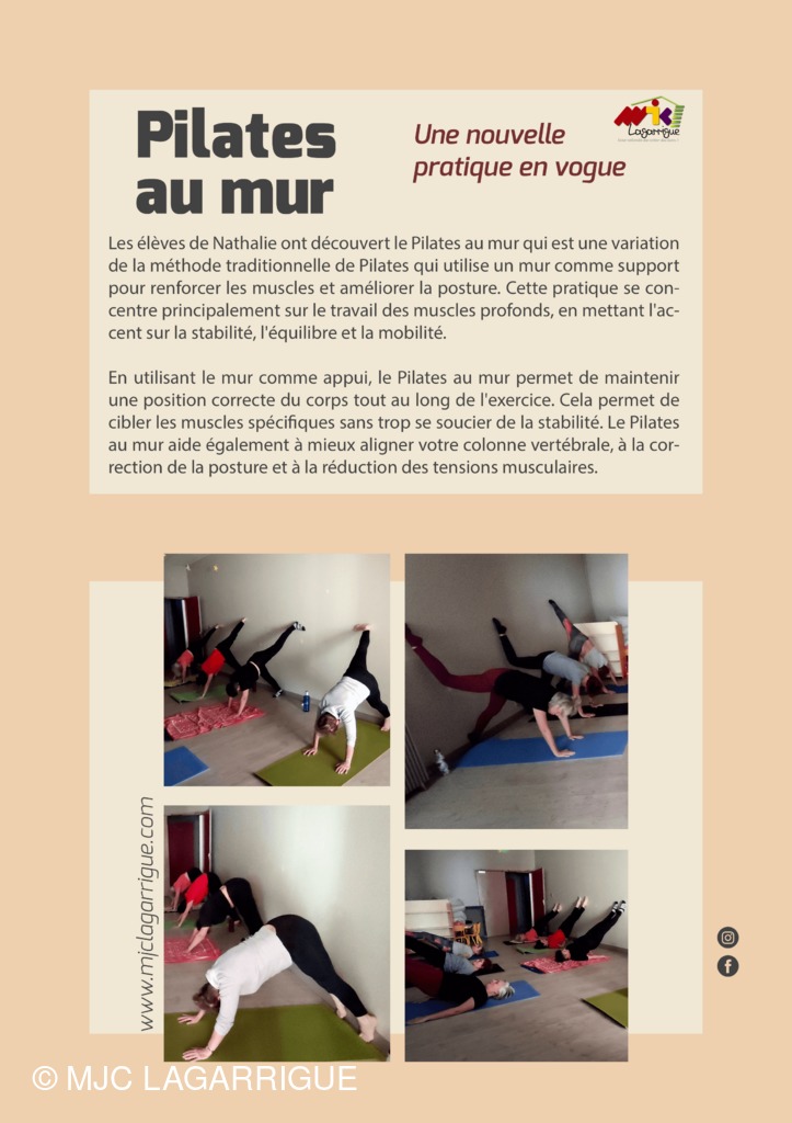 Les élèves de Nathalie ont découvert le Pilates au mur qui est une variation de la méthode traditionnelle de Pilates qui utilise un mur comme support pour renforcer les muscles et améliorer la posture. Cette pratique se concentre principalement sur le travail des muscles profonds, en mettant l'accent sur la stabilité, l'équilibre et la mobilité.