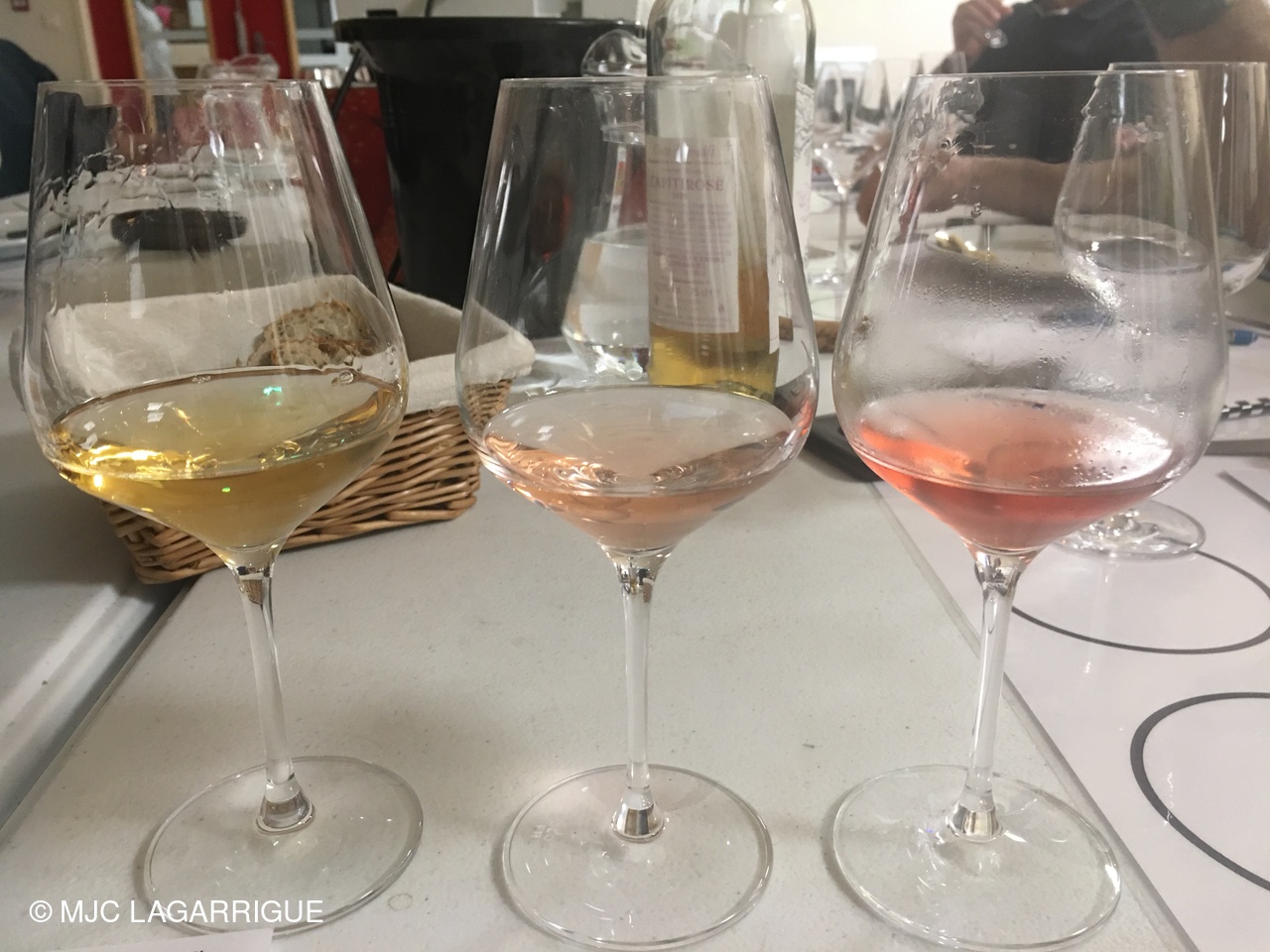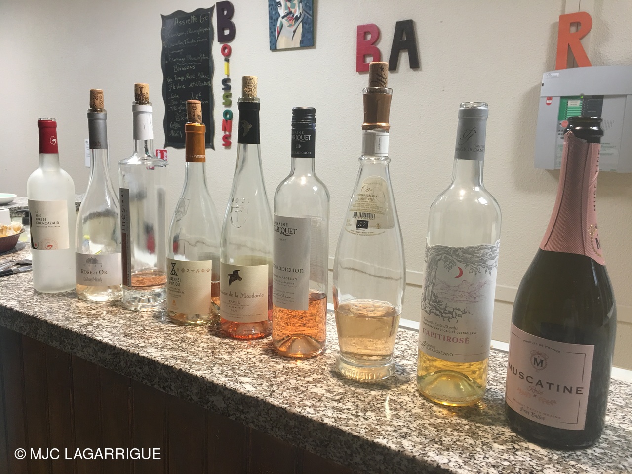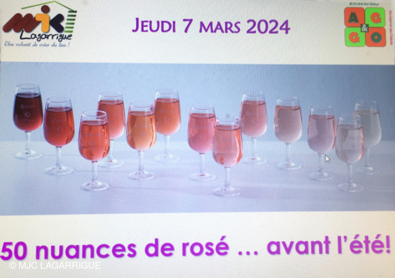 Voià 3 photos de la superbe soirée oenologie sur les rosés du 7 mars 2024 montrant effectivement toutes les nuances de couleur. animation: Francine Calmels, oenologue.