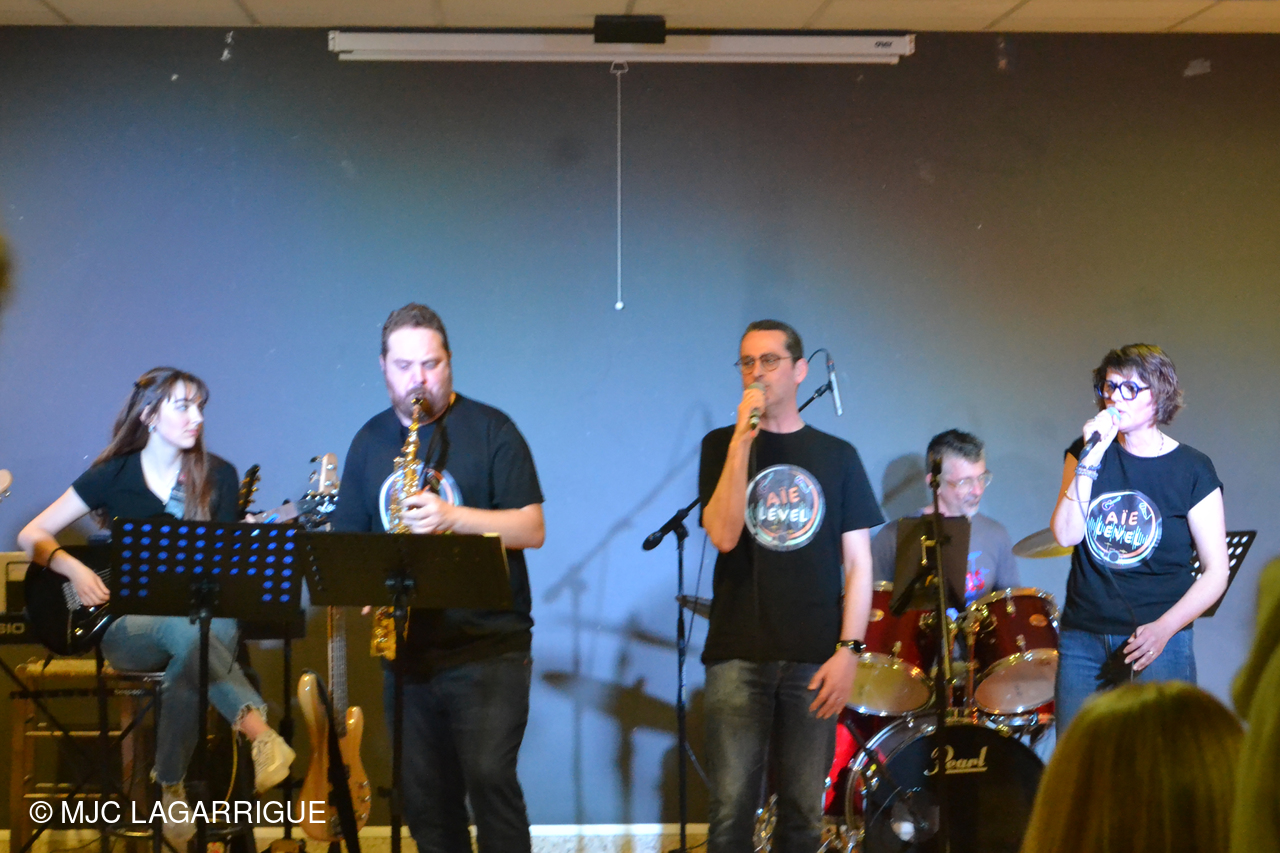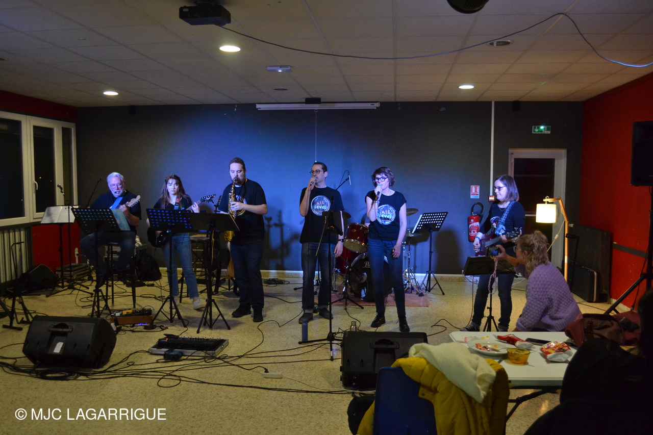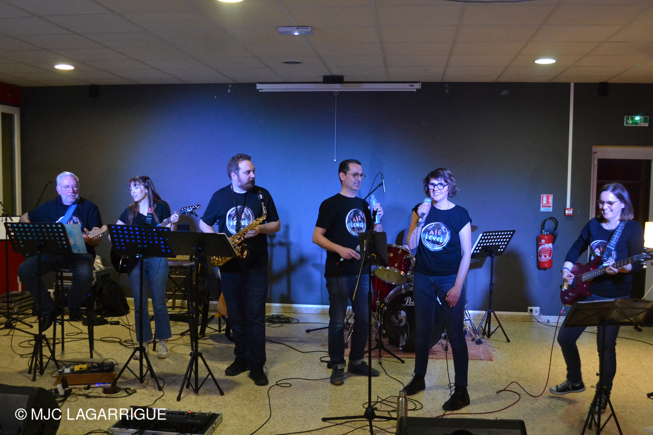 🎶 L'événement s'est poursuivi en beauté grâce à la prestation de notre talentueux groupe local résident de la MJC, "Aïe Level". 🎶 Cette rencontre musicale a permis à Peter Vincent de retrouver certains de ses anciens élèves, désormais membres du groupe "Aïe Level", aujourd'hui dirigé par l'incontournable François Madeuf, figure très appréciée de la MJC. Avec ses six musiciens passionnés — une chanteuse, un chanteur, un batteur, une bassiste, une guitariste et un saxophoniste — la formation a une fois de plus conquis le public avec son énergie communicative et sa grande complicité sur scène.