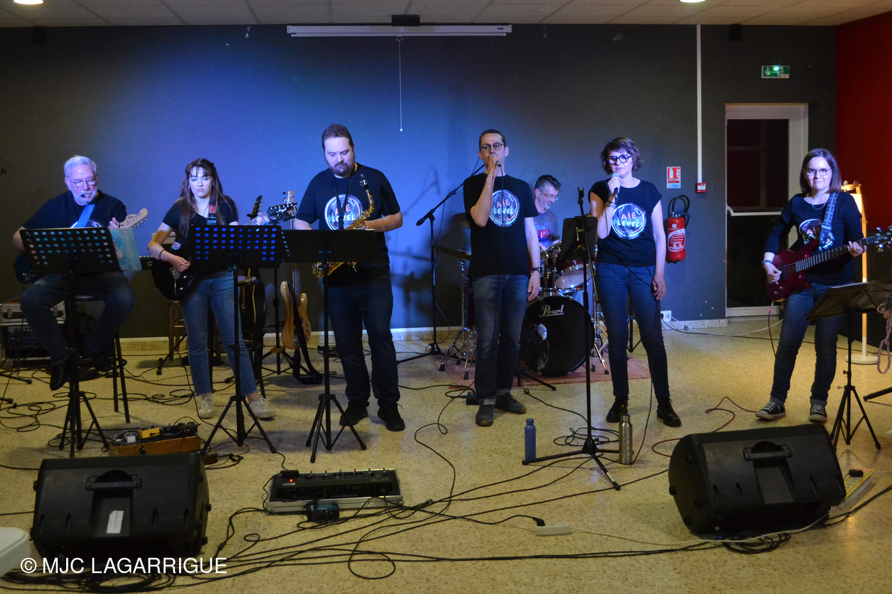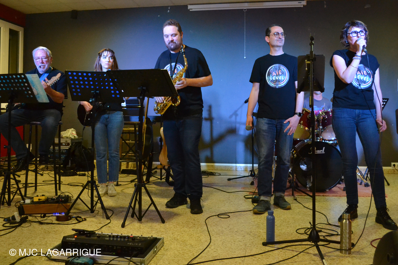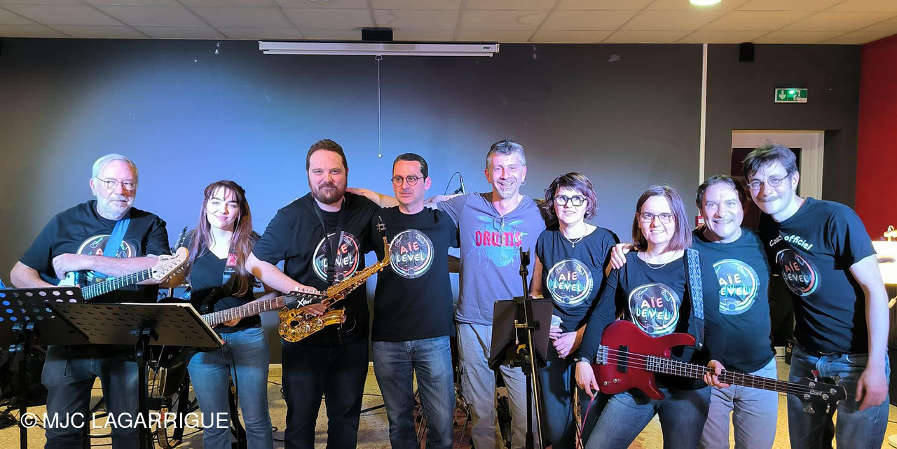 🎶 L'événement s'est poursuivi en beauté grâce à la prestation de notre talentueux groupe local résident de la MJC, "Aïe Level". 🎶 Cette rencontre musicale a permis à Peter Vincent de retrouver certains de ses anciens élèves, désormais membres du groupe "Aïe Level", aujourd'hui dirigé par l'incontournable François Madeuf, figure très appréciée de la MJC. Avec ses six musiciens passionnés — une chanteuse, un chanteur, un batteur, une bassiste, une guitariste et un saxophoniste — la formation a une fois de plus conquis le public avec son énergie communicative et sa grande complicité sur scène.