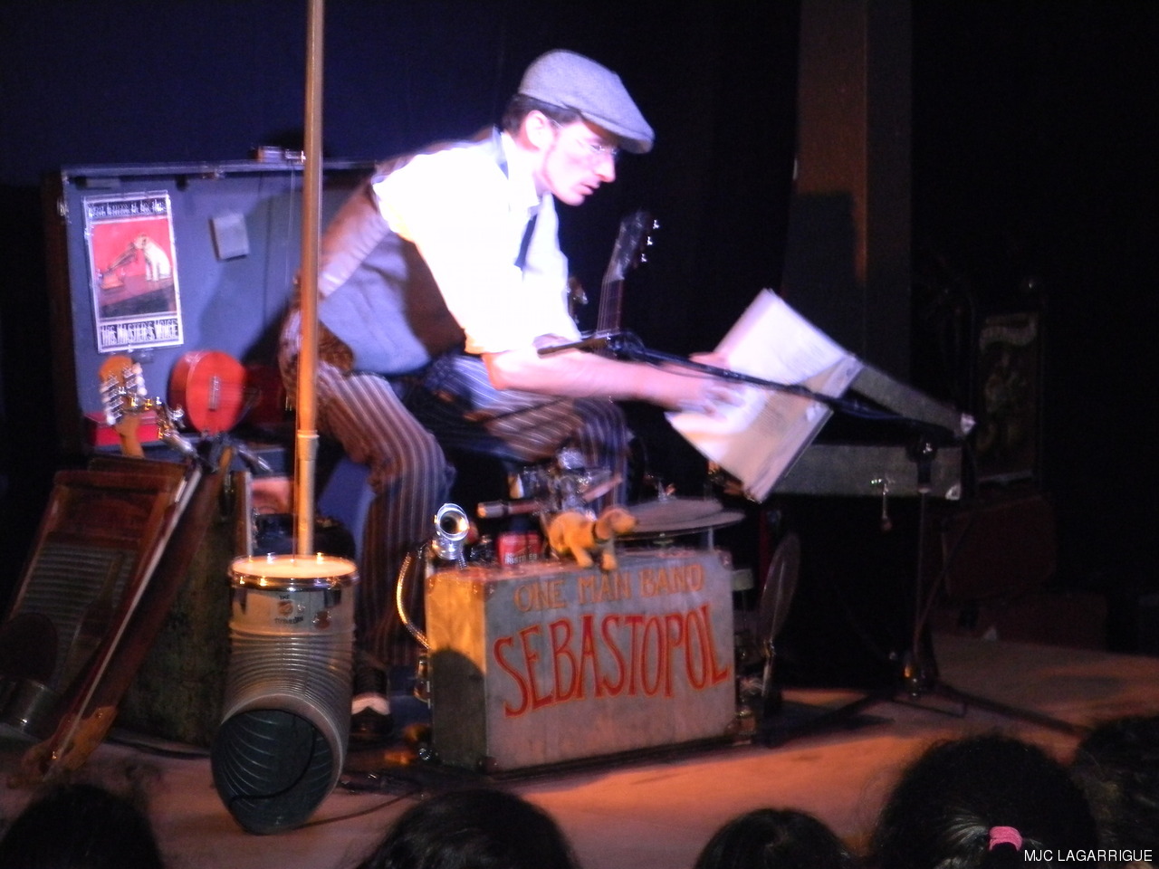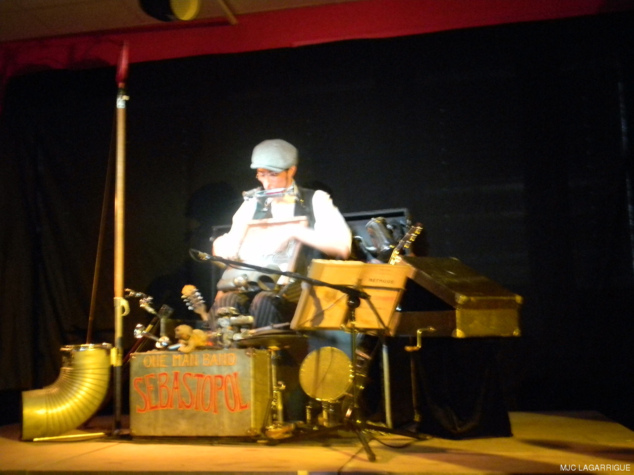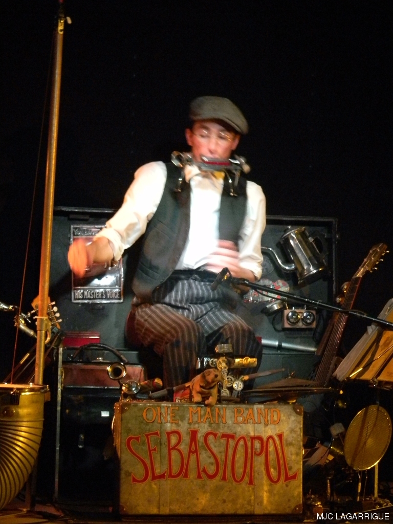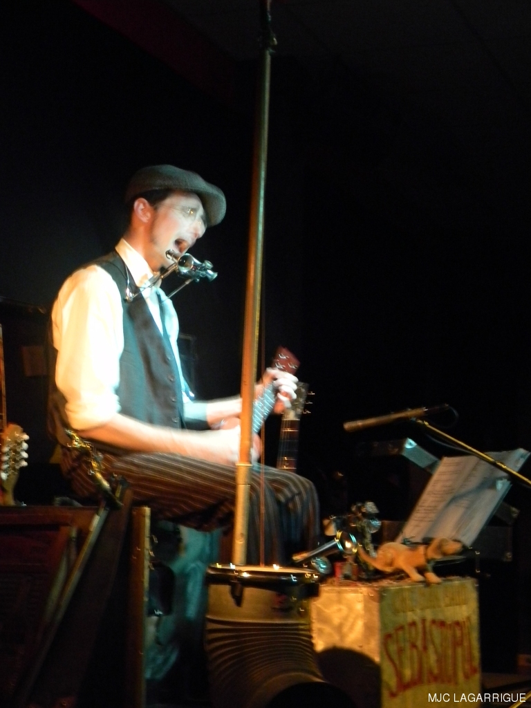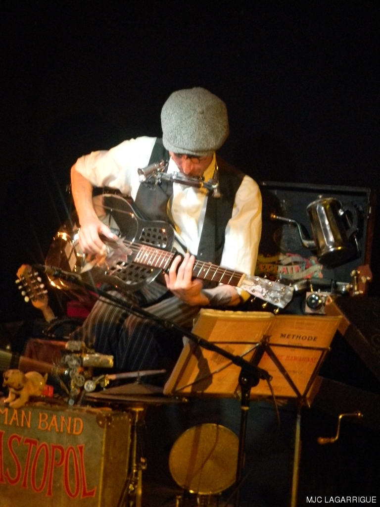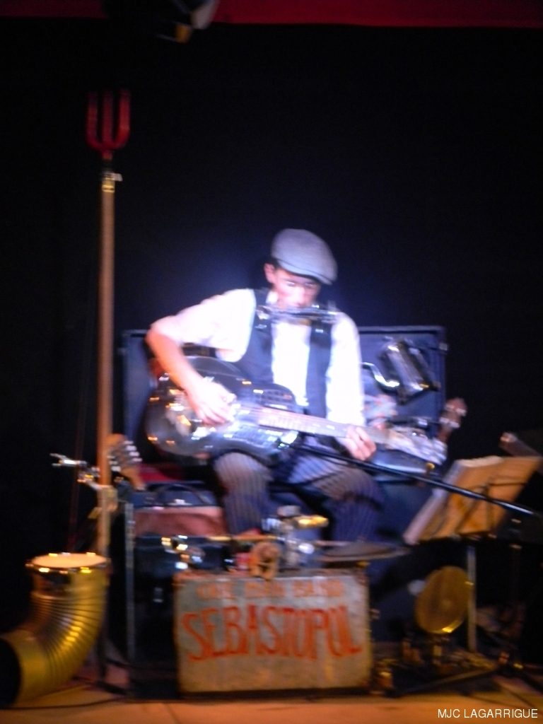 Sébastopol, c’est l’essence même du one man band ( l’homme orchestre). Un bricoleur de génie, tout droit sorti d’une machine à voyager dans le temps qui se serait arrêtée aux année 1930 quand le blues était joué à même le bitume, ou dans les « honky tonk » des villes du sud des Etats-Unis. Un blues des racines magnifiquement servi par un excellent musicien lunaire, authentique et enthousiaste. La rumeur allant bon train, elle fait du tarnais Sébastopol une des étoiles montantes du blues hexagonal, se produisant dans tous les rendez-vous incontournables : une ouverture de la 4ème édition de la semaine sans télé comme on en rêve ! RÉCUPÉRATION DES PHOTOS 1. Positionnez le pointeur de la souris sur la photo choisie et cliquer dessus pour agrandir. 2. Activez le bouton droit de la souris, un menu contextuel s'ouvre. 3. Activez dans ce menu le choix "Save Image As..." ou "Enregistrer l'image sous..." 4. Une fenêtre s'ouvre et vous y indiquerez le lecteur (disque dur, clé USB) et le répertoire où vous souhaitez que la photo soit enregistrée. Vous pouvez aussi faire défiler les photos sous forme de diaporama après agrandissement.
