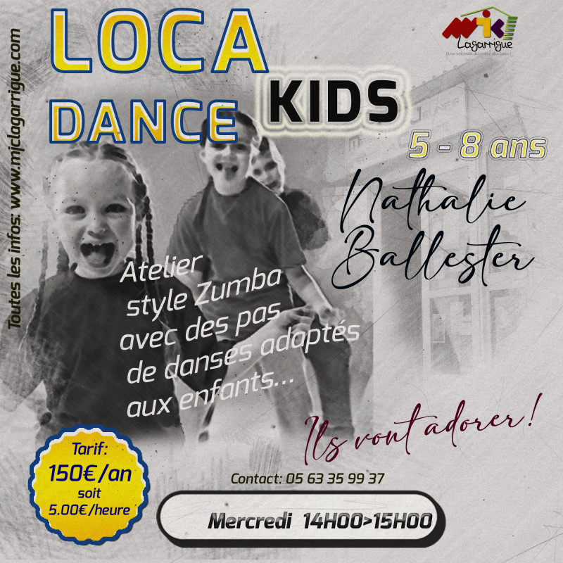 La loca Dances enfants est une sorte d'atelier style Zumba, avec des pas de danses, mouvements rythmiques et chorégraphie. Votre enfant peut faire une séance d'essai gratuite pour voir si cet atelier lui convient. Il suffit d'apeler le secrétariat au 05 63 35 99 37 pour que l'on puisse signaler sa présence à l'intervenante.